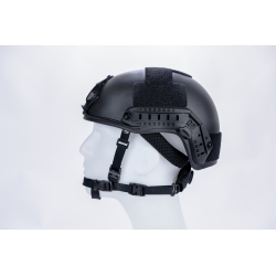 Le casque est équipé d'un harnais-mentonnière avec 4 points de fixation, d'un port universel pour instruments de vision nocturne-NVG-  et de rails Picatinny.